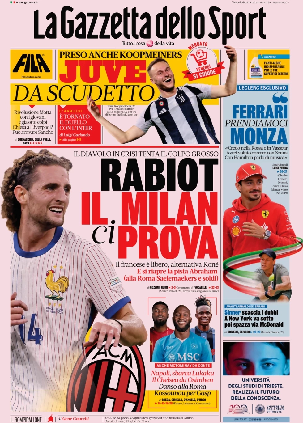 La Gazzetta dello Sport titola: “Rabiot, il Milan ci prova”. In alto: “Juve da scudetto”. In taglio basso: “Napoli, sbarca Lukaku. Il Chelsea da Osimhen. Danso alla Roma. Kossounou per Gasp”.