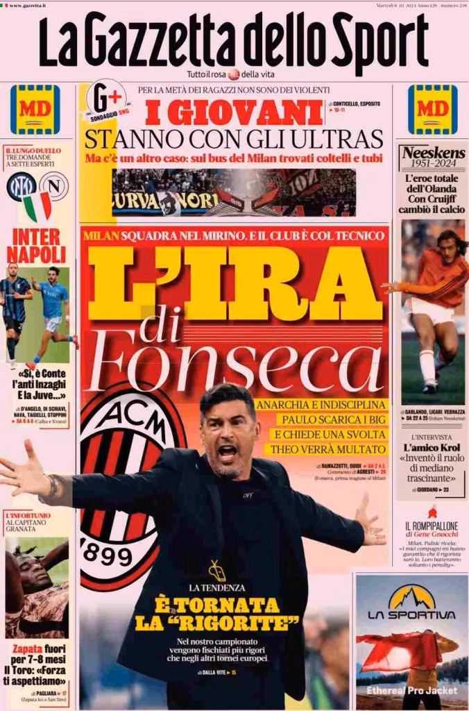 La Gazzetta dello Sport titola: “L’ira di Fonseca”. In taglio basso ancora spazio ai rossoneri: “È tornata la rigorite”. In alto: “I giovani stanno con gli ultras”. A lato: “Inter-Napoli. Sì è Conte l’anti Inzaghi. E la Juve…”, “Zapata fuori per 7-8 mesi. Il Toro: Forza ti aspettiamo” e “Neeskens 1951-2024. L’eroe totale dell’Olanda. Con Cruijff cambiò il calcio”.