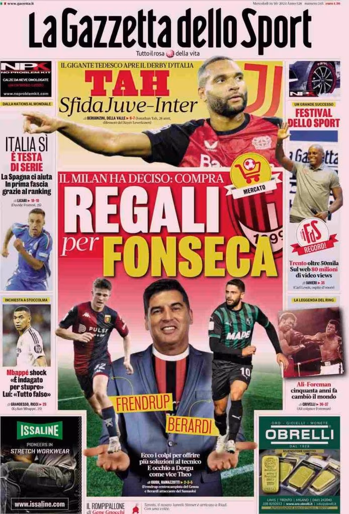 La Gazzetta dello Sport titola: “Regali per Fonseca. Frendrup e Berardi”. In taglio alto spazio al derby d’Italia anche sul mercato: “Tah, sfida Juve-Inter”. A lato: “Italia sì. È testa di serie”, “Mbappe shock: È indagato per stupro. Lui: Tutto falso”, “Festival dello Sport. Trento oltre 50mila. Sul web 80 milioni di video views” e “Ali-Foreman cinquanta anni fa cambiò il mondo”.