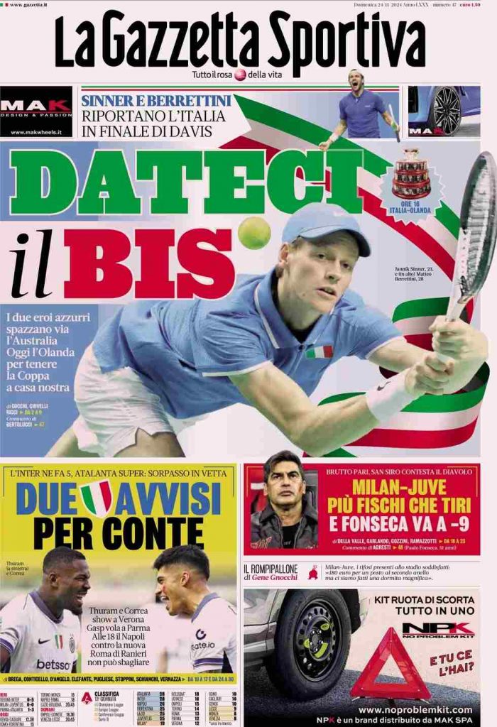 La Gazzetta dello Sport apre con il tennis: “Dateci il bis”. Il riferimento è alla Coppa Davis: “Sinner e Berrettini riportano l’Italia in finale di Davis. I due azzurri spazzano via l’Australia. Oggi l’Olanda per tenere la Coppa a casa nostra”. In taglio basso: “Due avvisi per Conte” e “Milan-Juve, più fischi che tiri. E Fonseca va a -9“.