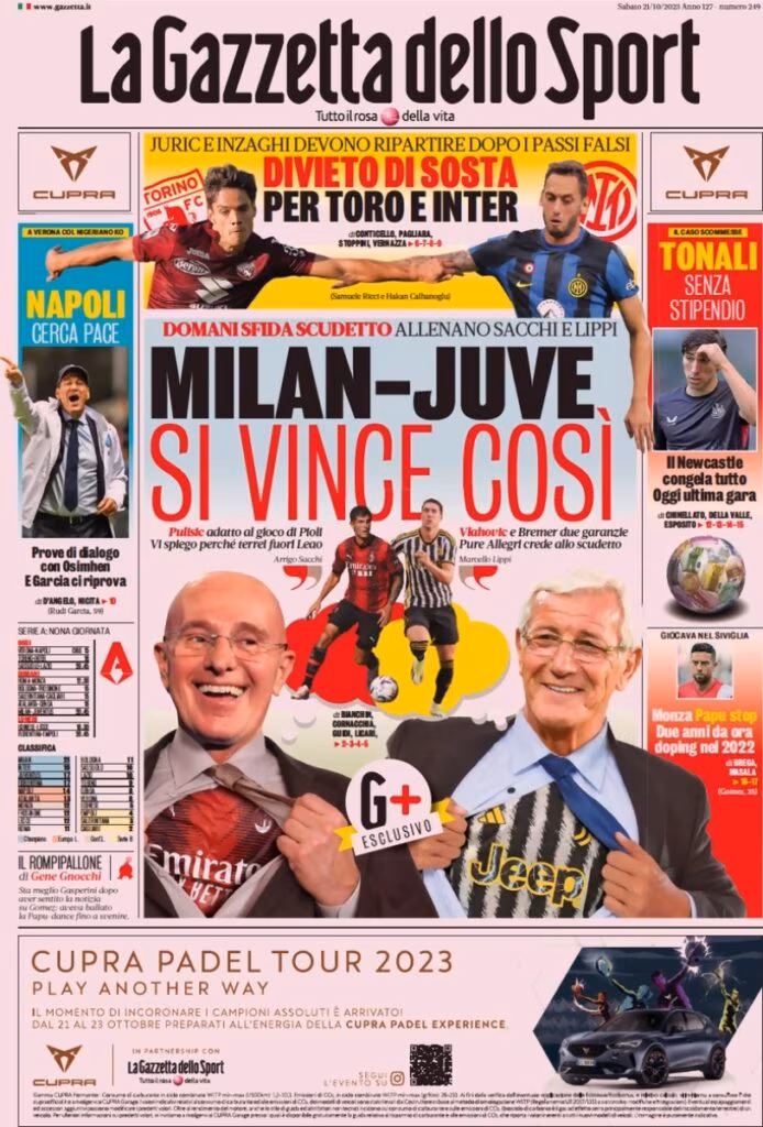 La Gazzetta dello Sport apre in prima pagina con una doppia intervista a Sacchi e Lippi: “Milan-Juve, si vince così”. In taglio alto spazio al match tra Torino e Inter: “Divieto di sosta per Toro e Inter”. A lato novità sul Napoli: “Napoli cerca pace. Prove di dialogo con Osimhen. E Garcia ci riprova”.