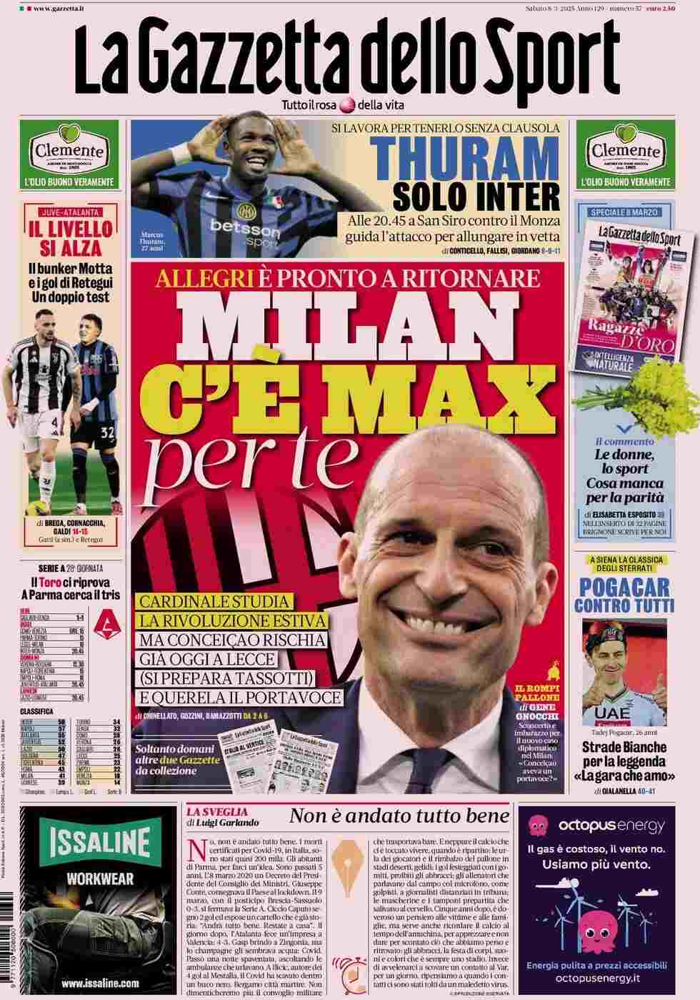 La Gazzetta dello Sport apre con il futuro della panchina rossonera: “Milan, c’è Max per te. Allegri pronto a ritornare“. In alto: “Thuram solo Inter”. A lato: “Il livello si alza. Il bunker Motta e i gol di Retegui. Un doppio test”, “Le donne, lo sport. Cosa manca per la parità”, “Pogacar contro tutti” e “Il Toro ci riprova. A Parma cerca il tris”.