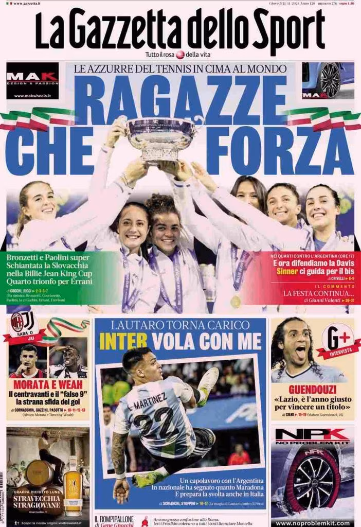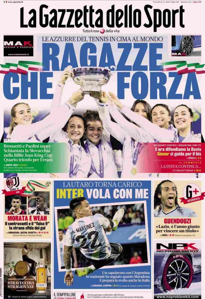 La Gazzetta dello Sport apre con il tennis: “Ragazze che forza”. E ancora: “Bronzetti e Paolini super. Schiantata la Slovacchia nella Billie Jean King Cup. Quarto trionfo per Errani” e “E ora difendiamo la Davis. Sinne ci guida per il bis”. In taglio basso: “Lautaro torna carico. Inter vola con me”, “Morata e Weah. Il centravanti e il falso 9, la strana sfida del gol” e un’intervista esclusiva a Guendouzi: “Lazio, è l’anno giusto per vincere un titolo”.