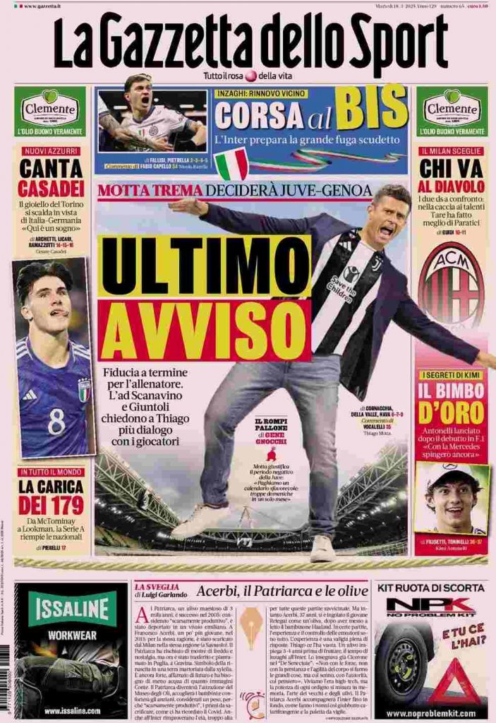 La Gazzetta dello Sport apre con il futuro della panchina bianconera: “Ultimo avviso. Motta trema: deciderà Juve-Genoa”. E ancora: “Fiducia a termine per l’allenatore. L’ad Scanavino e Giuntoli chiedono a Thiago più dialogo con i giocatori”. In alto: “Corsa al bis”. A lato: “Canta Casadei”, “La carica dei 179”, “Chi va al Diavolo” e “Il bimbo d’oro”.