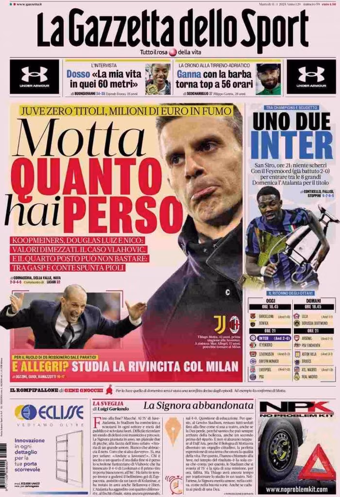 La Gazzetta dello Sport apre con la situazione in casa bianconera: “Motta quanto hai perso“. E ancora: “Juve zero titoli, milioni di euro in fumo”. E sotto: “E Allegri? Studia la rivincita col Milan”. In alto: “Dosso: La mia vita in quei 60 metri” e “Ganna con la barba torna top a 56 orari”. A lato: “Uno due Inter”. In taglio basso: “La Signora abbandonata”.