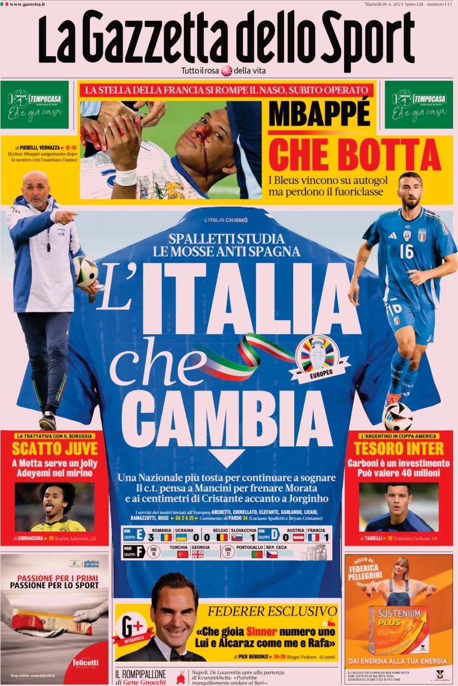 La Gazzetta dello Sport apre con gli Azzurri: “L’Italia che cambia”. In alto: “Mbappe che botta”. In taglio basso: “Scatto Juve. A Motta serve un jolly. Adeyemi nel mirino” e “Tesoro Inter. Carboni è un investimento. Può valere 40 milioni”.