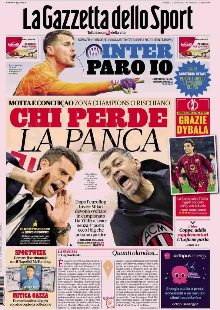 La Gazzetta dello Sport apre con Milan e Juve: “Chi perde la panca. Motta e Conceicao, zona Champions o rischiano”. E ancora: “Dopo l’euroflop Juve e Milan devono svoltare in campionato. Da Yildiz a Leao: senza 4 posto ecco i big che possono partire”. In taglio alto: “Inter, paro io”. A lato: “Grazie Dybala” e “Coppe, addio supplementari. L’UEFA ne parla”.