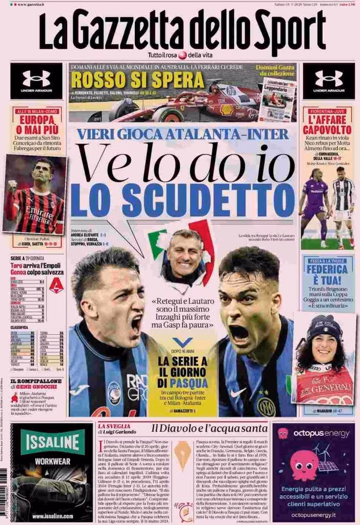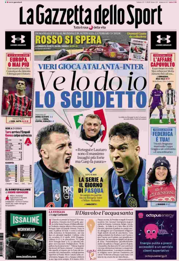 La Gazzetta dello Sport apre con un’intervista a Bobo Vieri su Atalanta-Inter: “Ve lo do io lo scudetto”. Sotto: “La Serie A il giorno di Pasqua”. In alto: “Rosso si spera”. A lato: “Europa o mai più”, “Toro arriva l’Empoli. Genoa colpo salvezza”, “L’affare capovolto. Kean rinato in viola. Nico rebus per Motta. Almeno fino ad ora…” e “Federica è tua!”. In basso: “Il Diavolo e l’acqua santa”.