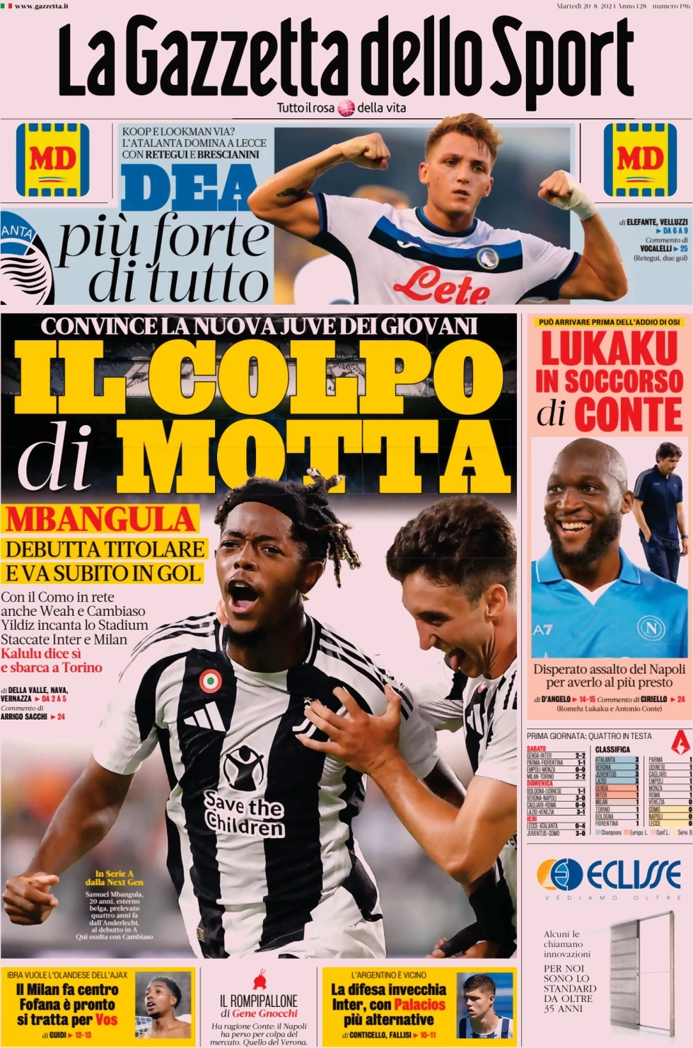 “Il colpo di Motta”, questo il titolo de La Gazzetta dello Sport che apre con la scelta vincente di schierare dal primo minuto Mbangula. In taglio alto: “Dea più forte di tutto”. A lato: “Lukaku in soccorso di Conte”. In basso: “Il Milan fa centro. Fofana è pronto si tratta per Vos” e “La difesa invecchia. Inter, cono Palacios più alternative”.