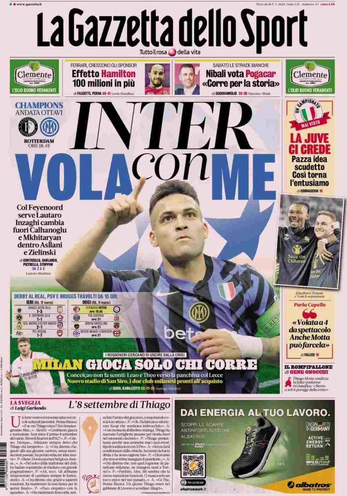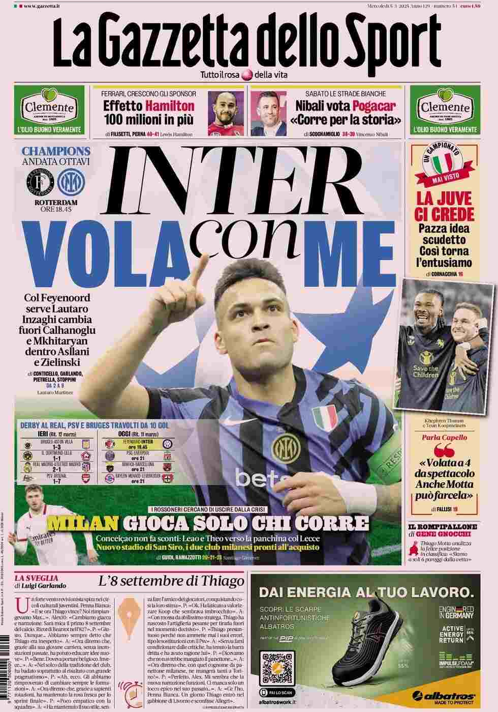 La Gazzetta dello Sport apre con la Champions League: “Inter, vola con me. Col Feyenoord serve Lautaro. Inzaghi cambia, fuori Calhanoglu e Mkhitaryan, dentro Asllani e Zielinski”. In alto: “Effetto Hamilton: 100 milioni in più” e “Nibali vola Pogacar: Corre per la storia”. A lato: “La Juve ci crede. Pazza idea scudetto. Così torna l’entusiasmo” e le parole di Capello sulla lotta scudetto: “Volata a 4 da spettacolo. Anche Motta può farcela”. In basso: “Milan, gioca solo chi corre”.