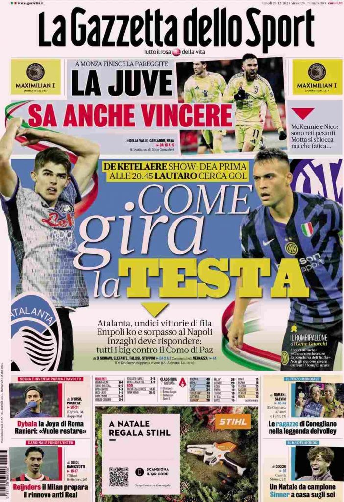 La Gazzetta dello Sport titola: “Come gira la testa”. E ancora: “De Ketelaere shot: Dea prima. Alle 20:45 Lautaro cerca gol”. In taglio alto: “La Juve sa anche vincere. McKennie e Nico sono reti pesanti. Motta si sblocca ma che fatica…”. In taglio basso: “Dybala la Joya di Roma. Ranieri: Vuole restare”, “Reijnders il Milan prepara il rinnovo anti Real”, “Le ragazze di Conegliano nella leggenda del volley” e “Un Natale da campione. Sinner a casa sugli sci”.
