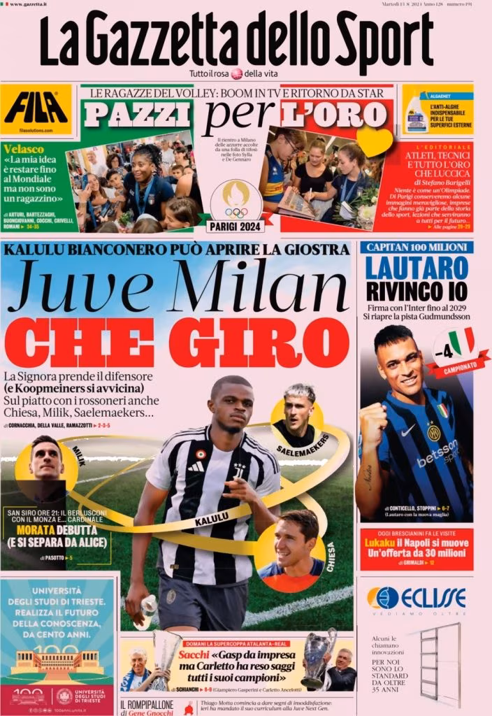 La Gazzetta dello Sport titola: “Juve Milan che giro”. A lato: “Lautaro rivinco io”. In alto: “Pazzi per l’oro”. In taglio basso: “Sacchi: Gasp da Impresa ma Carletto ha reso saggi tutti i suoi campioni”.