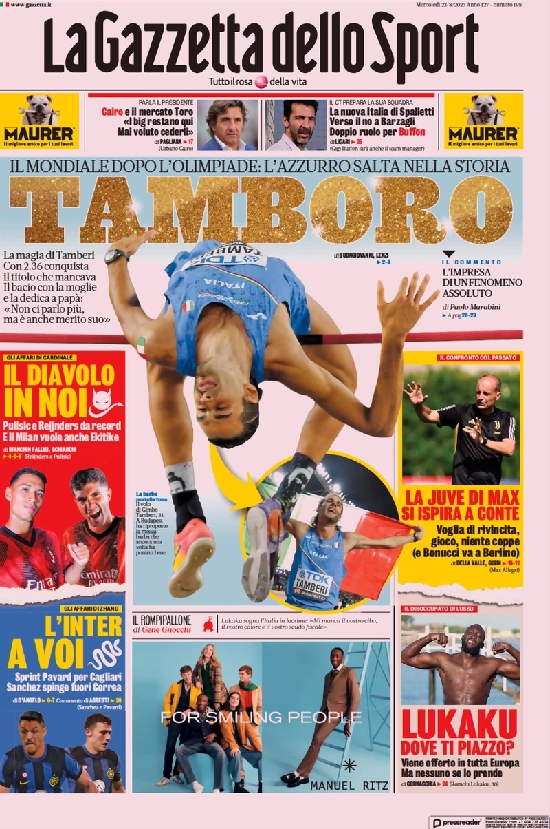 La prima pagina de La Gazzetta dello Sport di oggi è tutta dedicata alla medaglia d’oro di Tamberi nel salto in alto al Mondiale di atletica. A lato, però, spazio anche per la Juve: “La Juve di Max si ispira a Conte”. Subito sotto alcuni aggiornamenti sul caso Lukaku: “Lukaku dove ti piazzo? Viene offerto a tutta Europa ma nessuno se lo prende”.