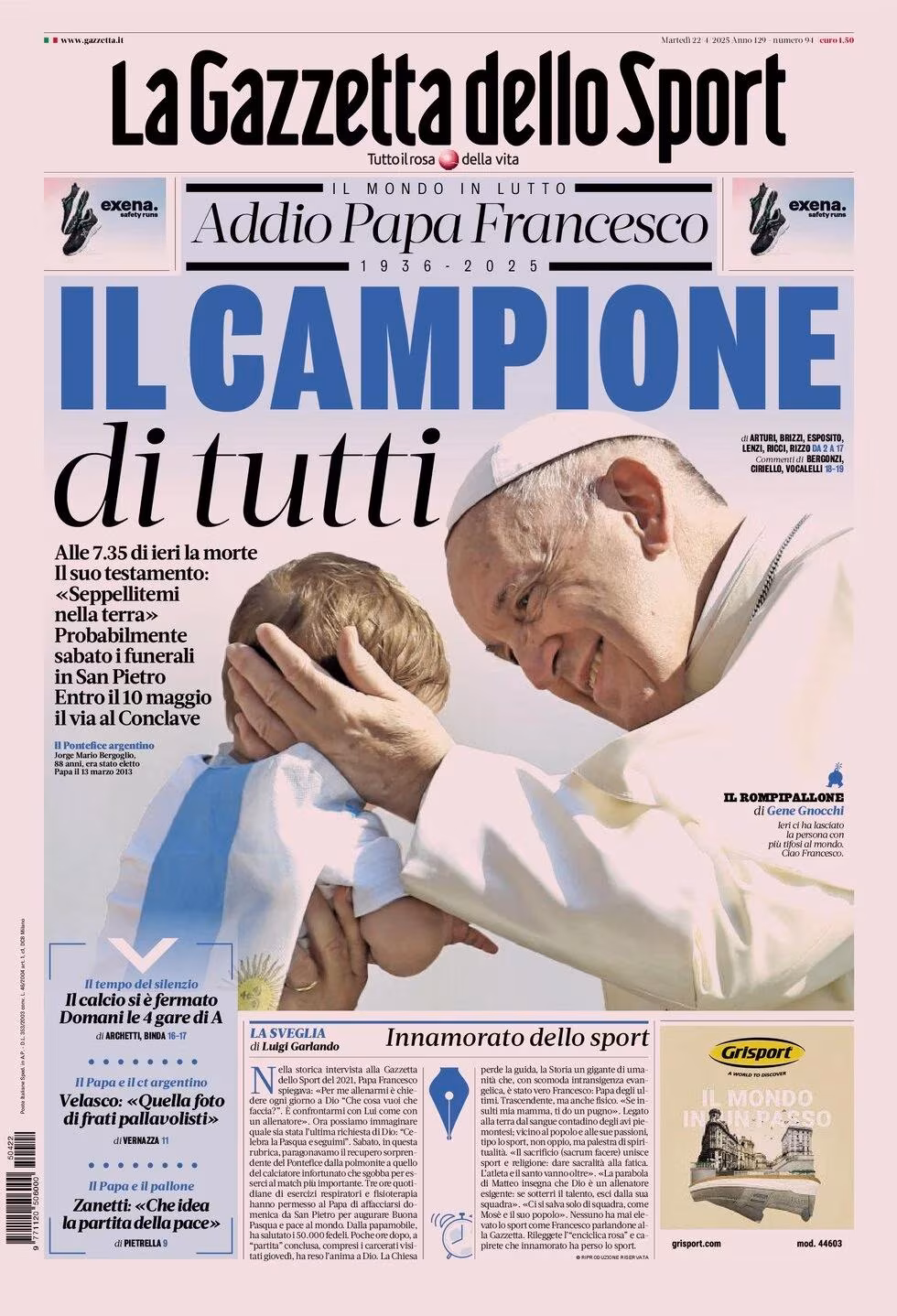 Il Corriere dello Sport titola: “Tanto Padre”. E ancora: “Alle 7:35 di ieri è morto Papa Francesco: il mondo dello sport, che lui amava, l’ha sentito sempre vicinissimo”.