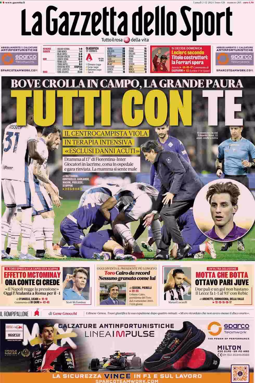 La Gazzetta dello Sport apre con il malore di Edoardo Bove in Fiorentina-Inter: “Tutti con te. Bove crolla in campo, la grande paura”. E ancora: “Il centrocampista viola in terapia intensiva: Esclusi danni acuti”. In taglio basso: “Effetto McTominay, ora Conte ci crede”, “Toro, Cairo da record. Nessuno granata come lui”, “Motta che botta. Ottavo pari Juve“.