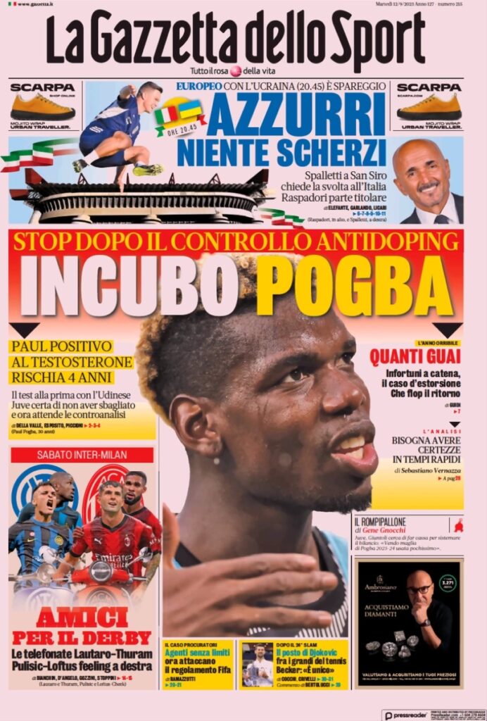 “Incubo Pogba. Stop dopo il controllo antidoping”, questo è il titolo sulla prima pagina de La Gazzetta dello Sport. “Paul positivo al testosterone, rischia 4 anni“. E poi ancora: “Quanti guai. Infortuni a catena, il caso d’estorsione. Che flop il ritorno”.