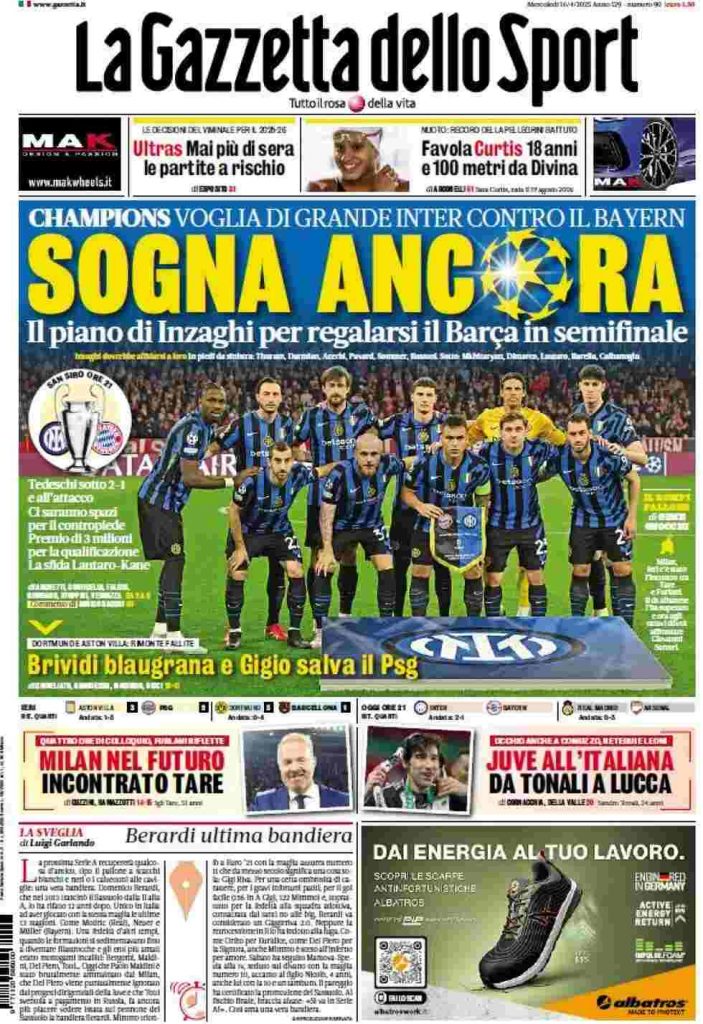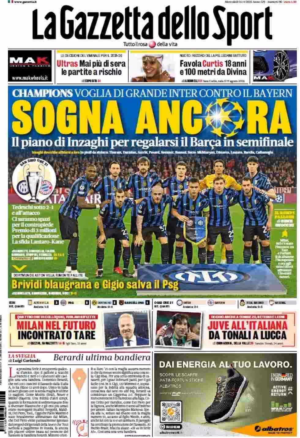 La Gazzetta dello Sport titola: “Sogna ancora. Il piano di Inzaghi per regalarsi il Barca in semifinale”. Sotto: “Brividi blaugrana e Gigio salva il PSG”. In taglio alto: “Ultras. Mai più di sera le partite a rischio” e “Favola Curtis. 18 anni e 100 metri da Divina”. In basso: “Milan nel futuro. Incontrato Tare” e “Juve all’italiana, da Tonali a Lucca“.