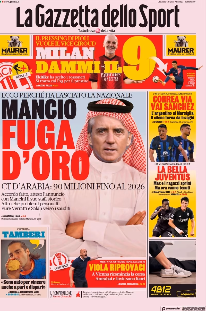 La prima pagina de La Gazzetta dello Sport in edicola oggi è dedicata a Roberto Mancini e l’offerta come ct dell’Arabia Saudita: “Mancio fuga d’oro. Ct d’Arabia: 90 milioni fino al 2026”. A lato spazio anche per la Juve: “La bella Juventus. Max e i ragazzi spinti, ma ora vanno tenuti”.