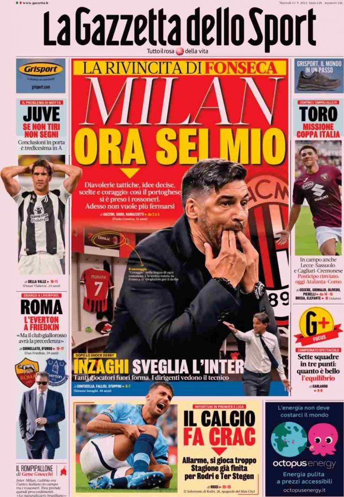 La Gazzetta dello Sport apre con i rossoneri: “Milan ora sei mio. La rinascita di Fonseca”. A lato spazio alla Vecchia Signora: “Juve se non tiri non segni. Il problema di motta: per conclusioni in porta è tredicesima in Serie A”. E ancora: “Roma, l’Everton ai Friedkin”, “Toro missione Coppa Italia” e “Sette squadre in tre punti: quanto è bello l’equilibrio“. In basso: “Il calcio fa crac”.