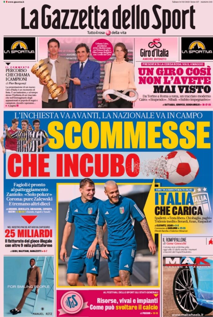 “Scommesse che incubo“, questo il titolo della prima pagina de La Gazzetta dello Sport. E ancora: “L’inchiesta va avanti, la nazionale va in campo”. La squadra di Spalletti, infatti, questa sera affronterà Malta.