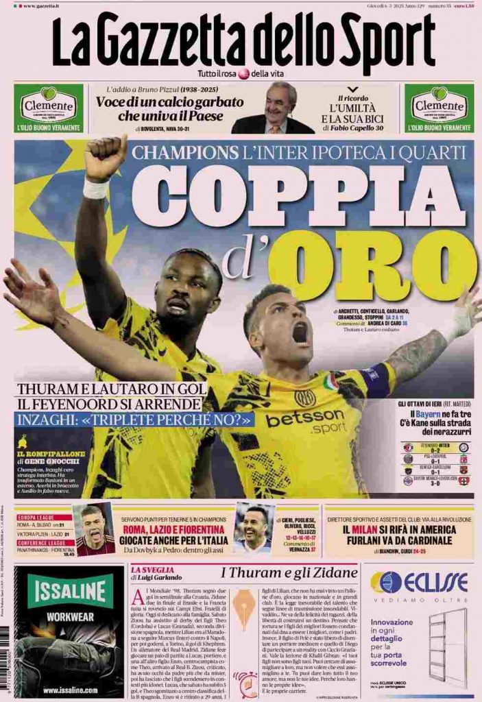 La Gazzetta dello Sport apre con la vittoria dell’Inter in Champions: “Coppia d’oro. Thuram e Lautaro in gol. Il Feyenoord si arrende. Inzaghi: Triplete perchè no?”. In alto il ricordo di Bruno Pizzul: “Voce di un calcio garbato che univa il paese”. In taglio basso: “Roma, Lazio e Fiorentina. Giocate anche per l’Italia” e “Il Milan si rifà in America. Furlani vede Cardinale”.