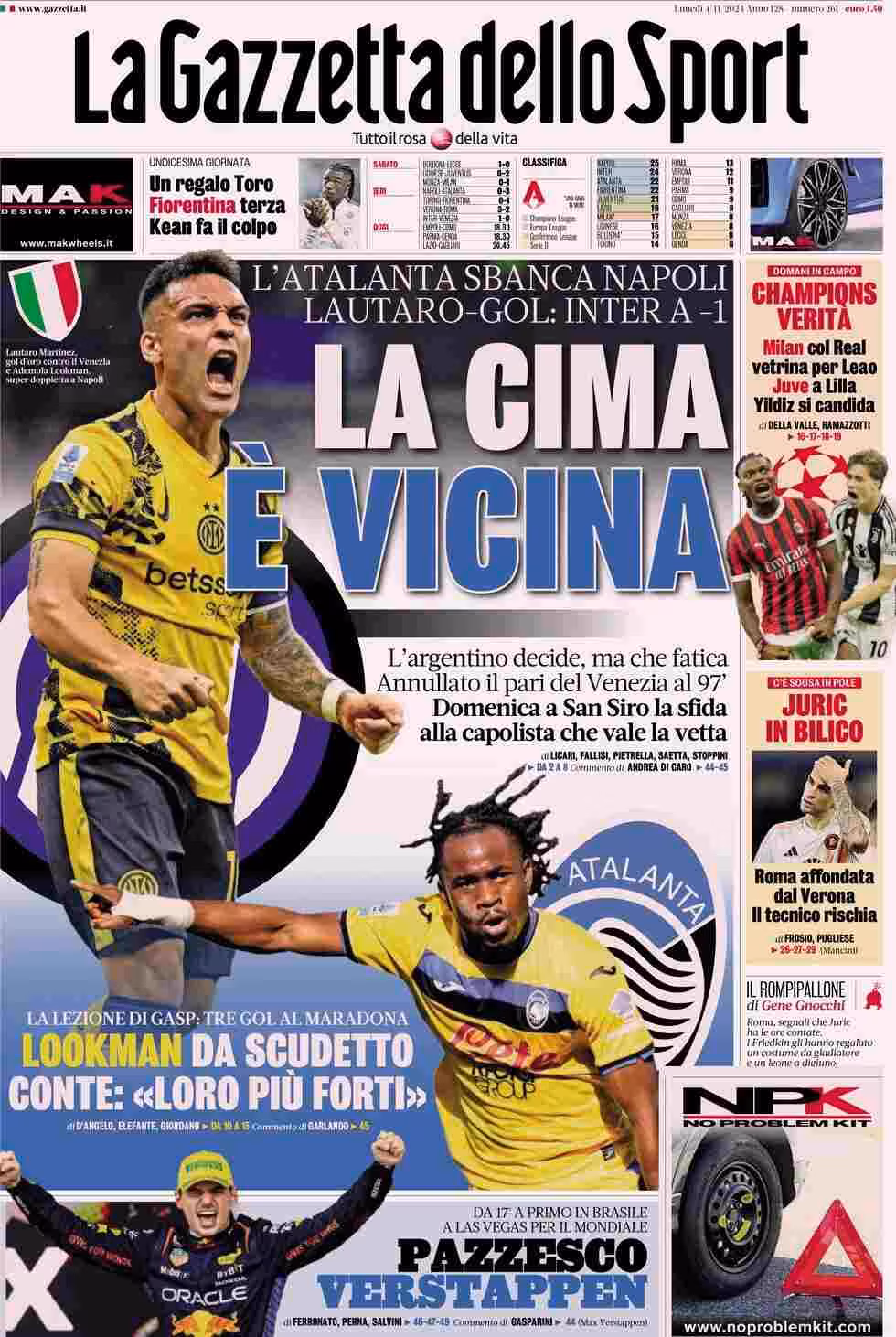 La Gazzetta dello Sport apre con le vittorie di Inter e Atalanta: “La cima è vicina. L’Atalanta sbanca Napoli. Lautaro-gol: Inter a -1“. In basso: “Lookman da scudetto. Conte: Loro più forti”. In alto: “Un regalo Toro. Fiorentina terza, Kean fa il colpo”. A lato: “Champions verità. Milan col Real vetrina per Leao. Juve a Lilla, Yildiz si candida” e “Juric in bilico. Roma affondata dal Verona. Il tecnico rischia”. In basso: “Pazzesco Verstappen”.