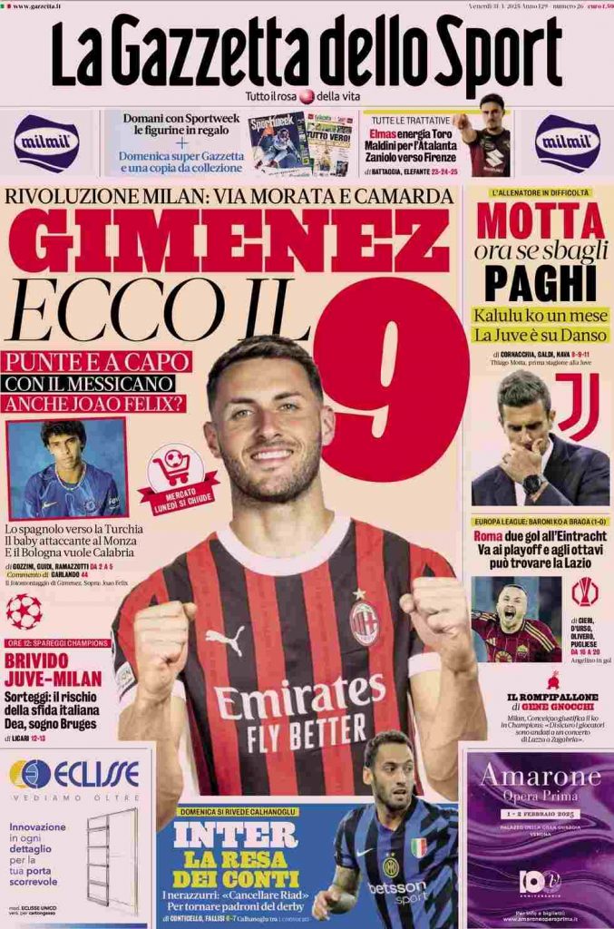 La Gazzetta dello Sport apre con il mercato del Milan: “Gimenez. Ecco il 9”. E ancora: “Rivoluzione Milan: via Morata e Camarda” e “Punte e a capo. Con il messicano anche Joao Felix?”. A lato: “Motta ora se sbagli paghi. Kalulu ko un mese. La Juve su Danso” e “Roma due gol all’Eintracht. Va ai playoff e agli ottavi può trovare la Lazio”. In basso: “Brivido Juve-Milan. Sorteggi: il rischio della sfida italiano. Dea, sogno Bruges” e “Inter, la resa dei conti”.