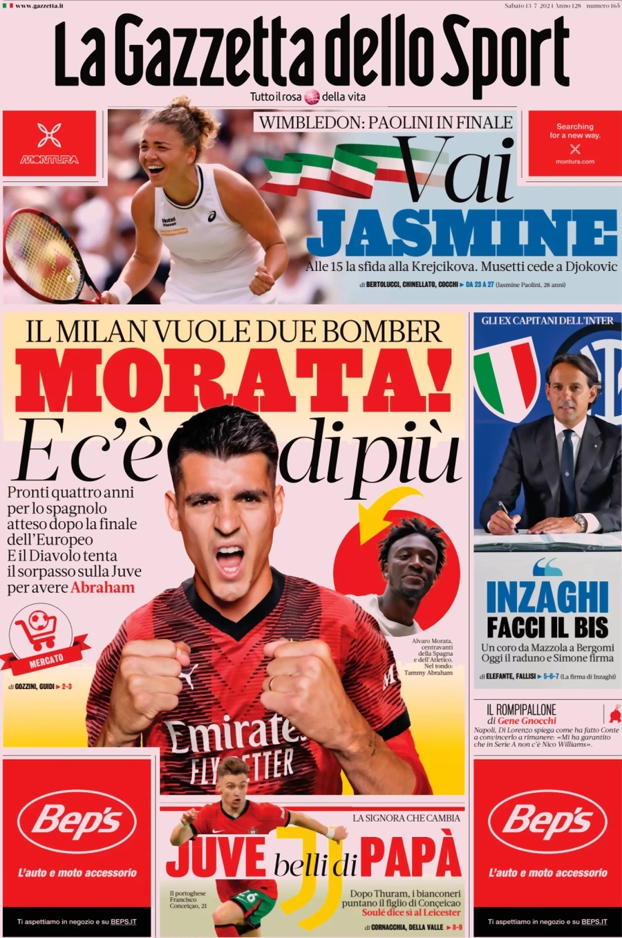La Gazzetta dello Sport titola: “Morata! E c’è di più”. A lato: “Inzaghi fa il bis”. In taglio alto: “Vai Jasmine”. Mentre in basso: “Juve, belli di papà”. E ancora: “Dopo Thuram, i bianconeri puntano il figlio di Conceicao. Soulè dice sì al Leicester”.