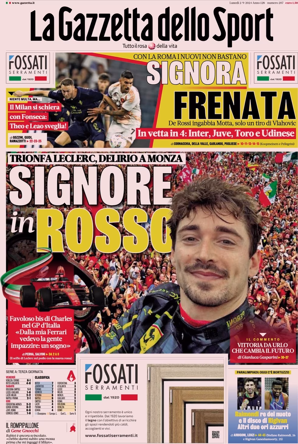 La Gazzetta dello Sport apre con la vittoria di Leclerc a Monza: “Signore in rosso”. In alto: “Signora frenata. In vetta in 4: Inter, Juve, Toro e Udinese” e “Il Milan si schiera con Fonseca: Theo e Leao sveglia!”.