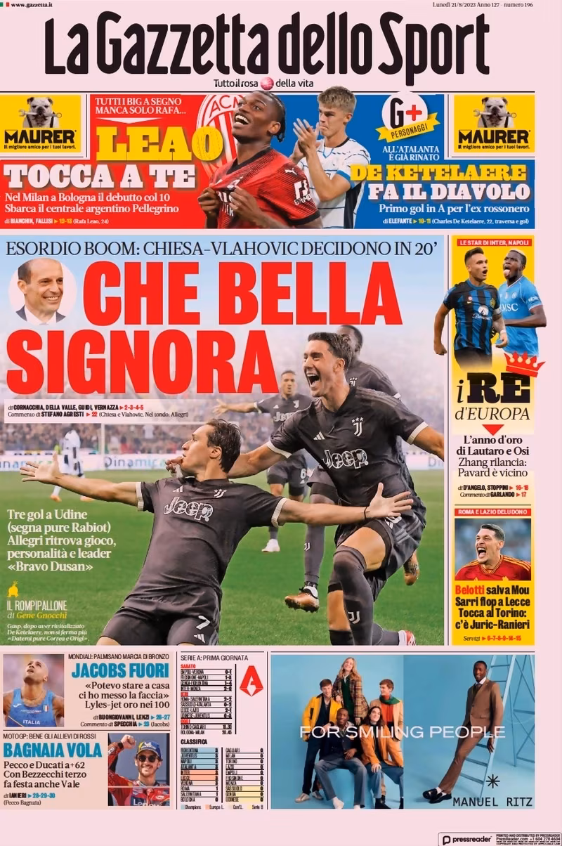 “Che bella signora”, questo il titolo sulla prima pagina de La Gazzetta dello Sport in edicola oggi. Il giornale milanese esalta il gioco della squadra di Allegri: “Esordio boom: Chiesa-Vlahovic decidono in 20′”. Il match contro l’Udinese ha convinto non solo per il risultato quanto più per il come è arrivato. Ottima partenza per i bianconeri nella prima uscita stagionale.