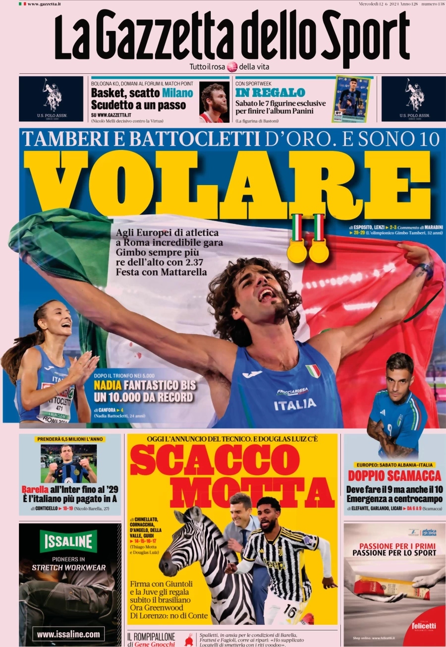 La Gazzetta dello Sport apre con la vittoria di Tamberi agli europei di atletica: “Volare”. In basso novità sulla Juve: “Scacco Motta. Oggi l’annuncio del tecnico, e Douglas Luiz c’è”. A lato: “Barella all’Inter fino al ’29. È l’italiano più pagato in A” e “Doppio Scamacca. Deve fare il 9 ma anche il 10. Emergenza a centrocampo”.