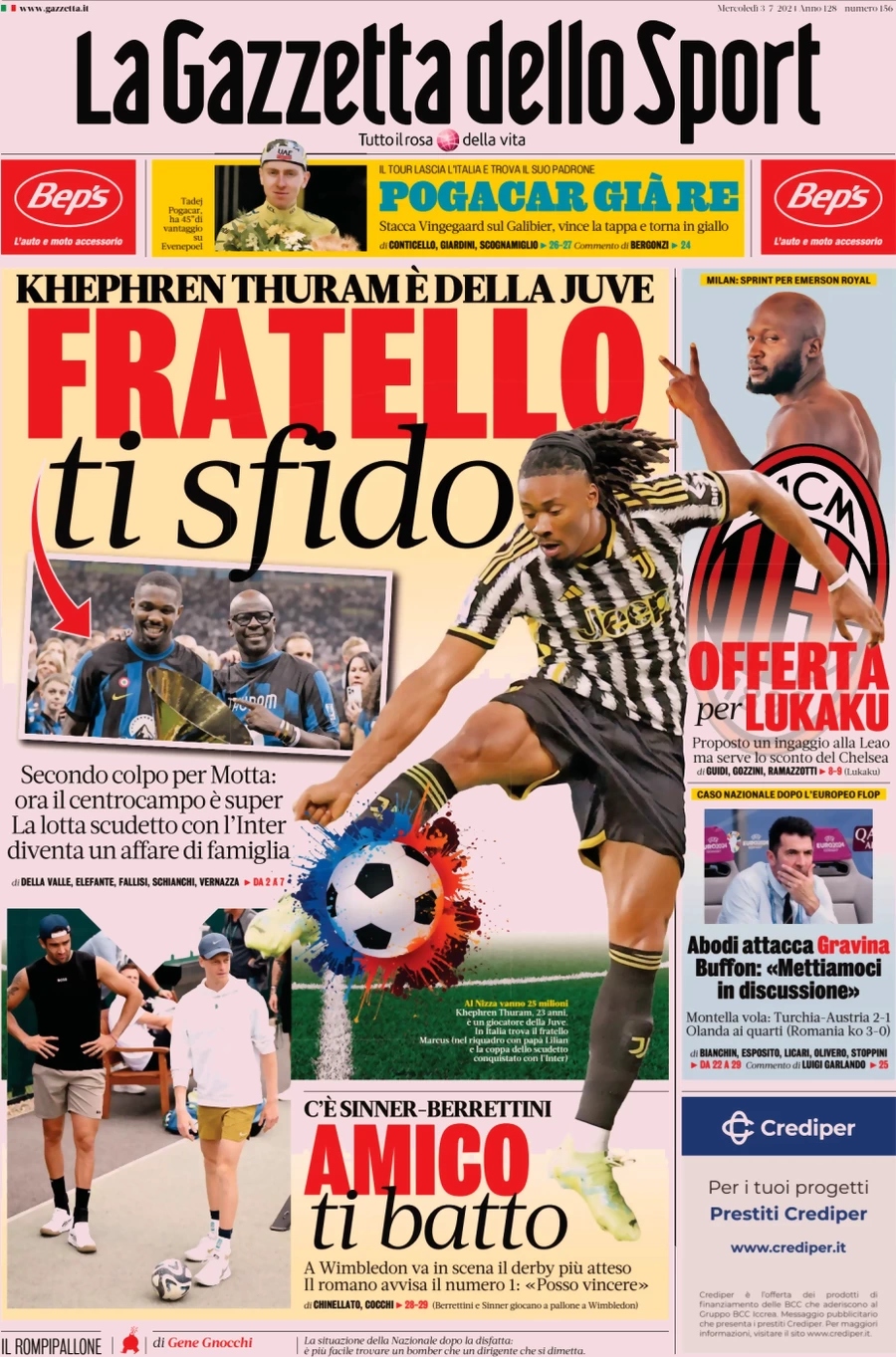 “Fratello ti sfido”, questo è il titolo de La Gazzetta dello Sport. Il riferimento è a Khephren Thuram, ormai quasi un giocatore della Juve e che si prepara a sfidare suo fratello Marcus. A lato: “Offerta per Lukaku” e “Abodi attacca Gravina. Buffon: Mettiamoci in discussione”.