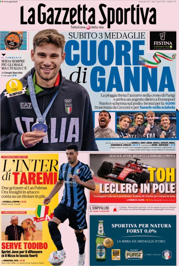 La Gazzetta dello Sport apre con le Olimpiadi: “Cuore di Ganna”. In taglio basso: “L’Inter di Taremi”, “Toh, Leclerc in pole” e “Serve Todibo“.
