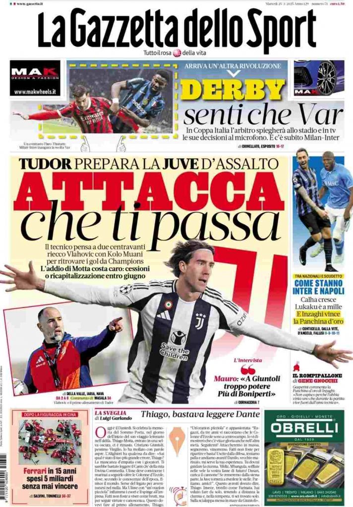 La Gazzetta dello Sport titola: “Attacca che ti passa. Tudor prepara la Juve d’assalto”. Sotto: “Mauro: A Giuntoli troppo potere. Più di Boniperti”. In alto: “Derby, sentite che VAR”. A lato: “Come stanno Inter e Napoli. Calha cresce, Lukaku è a mille. E Inzaghi vince la Panchina d’oro”. In basso: “Ferrari in 15 anni spesi 5 miliardi senza mai vincere”.