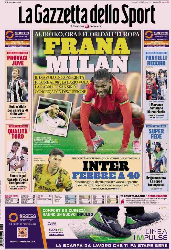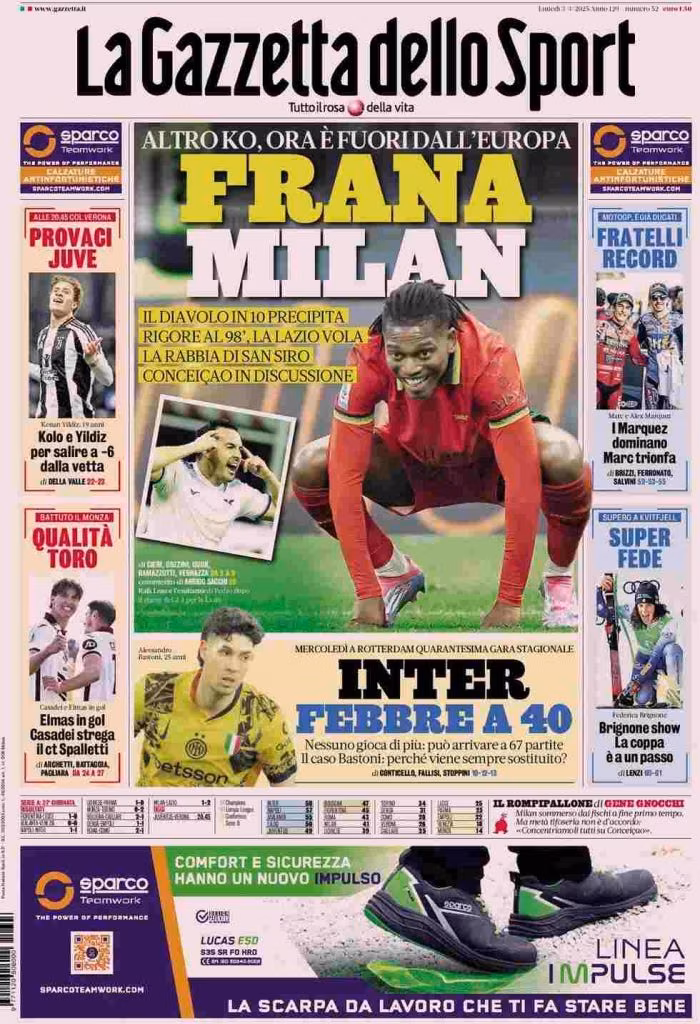 La Gazzetta dello Sport apre con la pesante sconfitta rossonera: “Frana Milan. Altro KO, ora è fuori dall’Europa”. A lato: “Provaci Juve. Kolo e Yildiz per salire a -6 dalla vetta“, “Qualità Toro”, “Fratelli record” e “Super Fede”. In taglio basso: “Inter, febbre a 40. Mercoledì a Rotterdam quarantesima gara stagionale”.