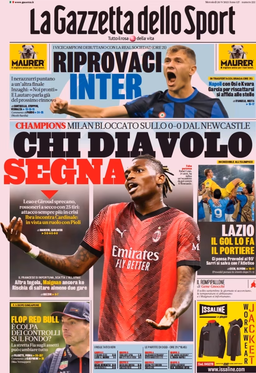La Gazzetta dello Sport in edicola oggi titola: “Chi diavolo segna. Champions, Milan bloccato sullo 0-0 dal Newcastle”. La Lazio pareggia invece con l’Atletico Madrid: “Lazio, il gol lo fa il portiere”. In taglio alto spazio all’Inter in campo questa sera: “Riprovarci Inter”.