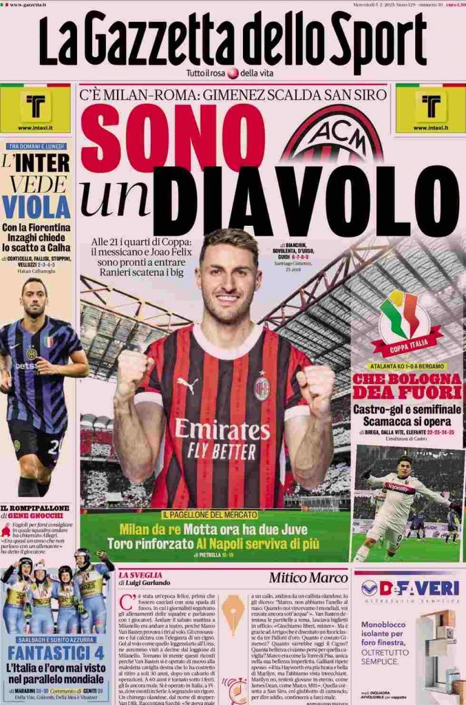 La Gazzetta dello Sport apre con la presentazione di Gimenez al Milan: “Sono un Diavolo. C’è Milan-Roma: Gimenez scalda San Siro”. Sotto: A lato: “L’Inter vede Viola. Con la Fiorentina Inzaghi chiede lo scatto a Calha” e “Che Bologna, Dea fuori. Castro-gol e semifinale. Scamacca si opera”. In taglio basso il pagellone del mercato: “Milan da re. Motta ora ha due Juve. Toro rinforzato. Al Napoli serviva di più”.
