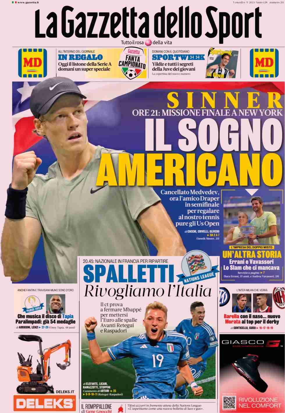 La Gazzetta dello Sport apre con Sinner: “Il sogno americano“. In basso spazio alla nazionale italiana di calcio: “Spalletti, rivogliamo l’Italia”. A lato: “Barella con il naso… nuovo. Morata al top per il derby”.