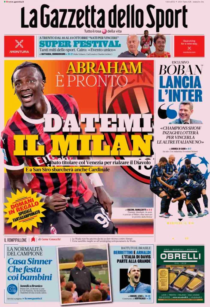 La Gazzetta dello Sport titola: “Datemi il Milan”. Il riferimento è ad Abraham che si prepara a scendere in campo da titolare contro il Venezia. A lato spazio a un’intervista esclusiva: “Boban lancia l’Inter: Champions show. Inzaghi lotterà per vincerla, le altre italiane no”. In taglio basso: “Casa Sinner. Che fasta coi bambini” e “Battuto il Brasile. Berrettini e Arnaldi, l’Italia di Davis parte alla grande”.