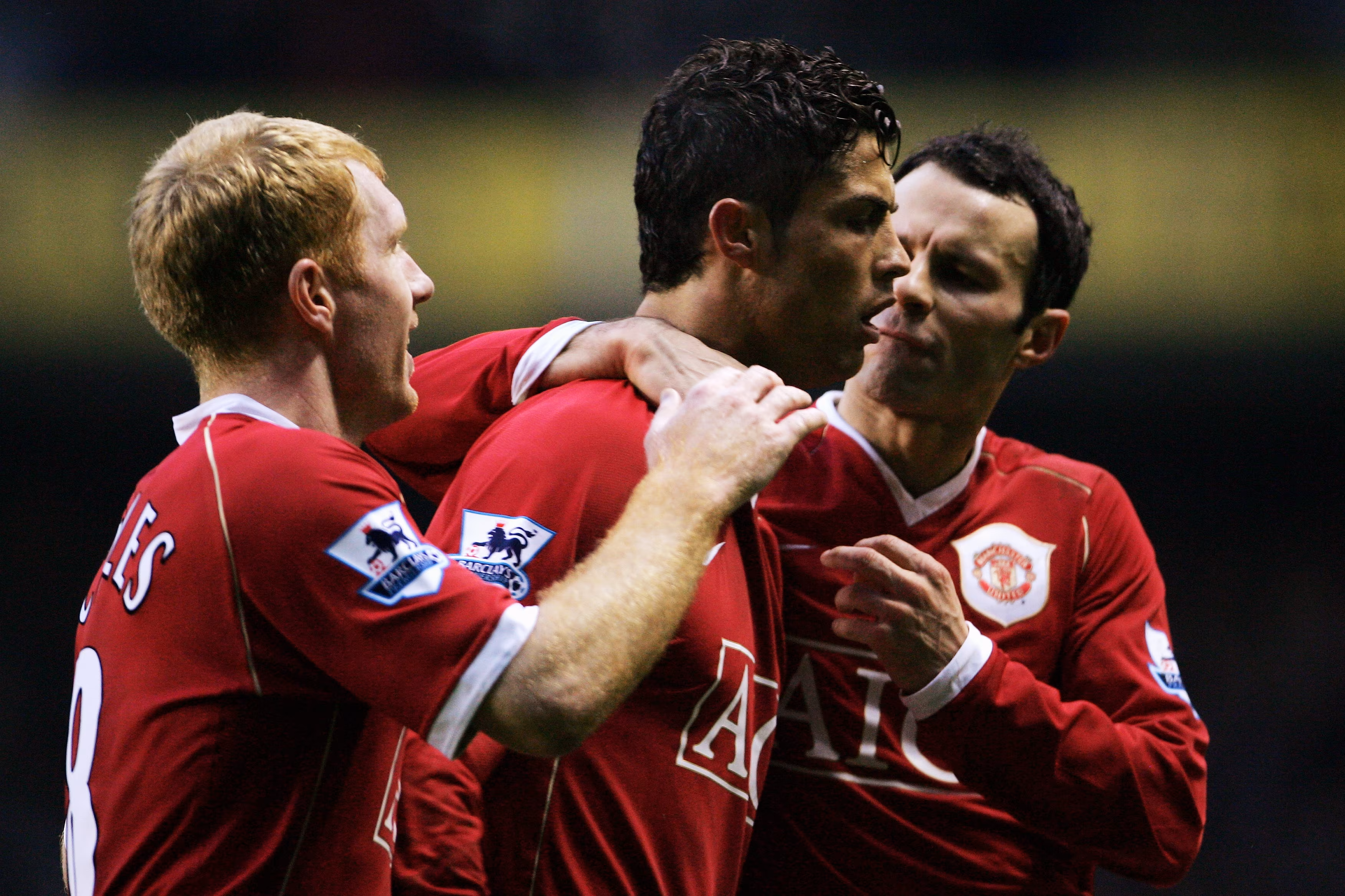 LONDON - FEBRUARY 04: Cristiano Ronaldo (C) of Manchester United celebrates after scoring a penalty with team mates Paul Scholes and Ryan Giggs during the Barclays Premiership match between Tottenham Hotspur and Manchester United at White Hart Lane on February 4, 2007 in London, England. (Photo by Phil Cole/Getty Images)