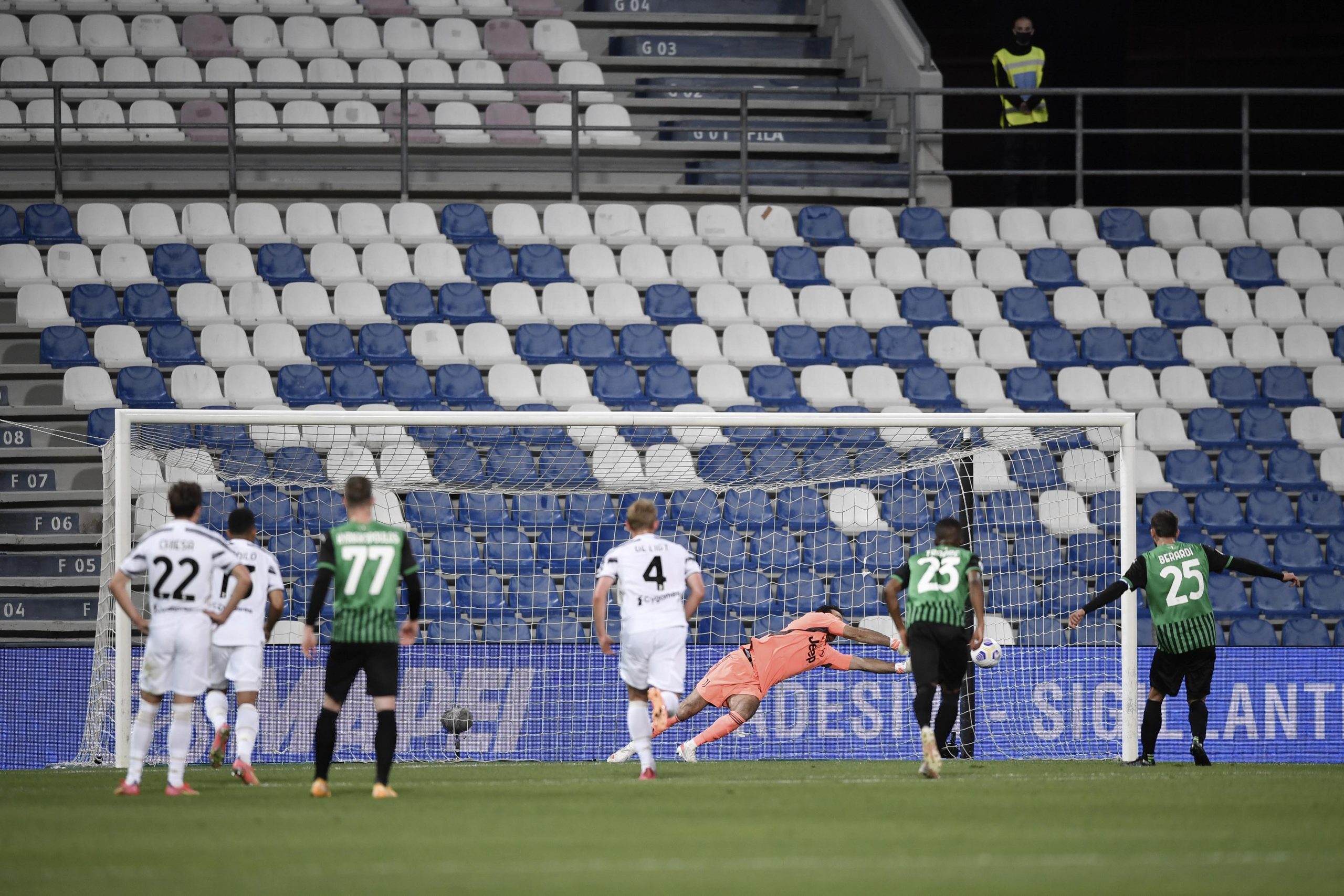 Buffon ipnotizza Berardi dal dischetto e neutralizza il rigore