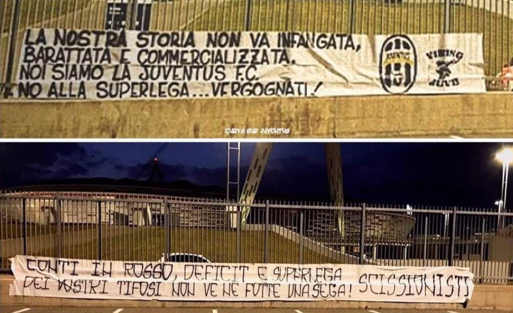 Il calcio è stato scioccato dalla nascita della Superlega, che dopo quanto accaduto nella notte sembra destinata a naufragare prima del previsto. I tifosi della Juventus, squadra tra le fondatrici della nuova competizione, hanno espresso il loro disappunto fuori dall’Allianz Stadium, dove nella notte sono apparsi due striscioni contro la decisione di Andrea Agnelli: “La nostra storia non va infangata, barattata e commercializzata. Noi siamo la Juventus F.C. No alla Superlega… Vergognati!” il messaggio non troppo velato rivolto al presidente bianconero da parte dei Viking, con un altro striscione che è apparso sui cancelli dello stadio: “Conti in rosso, deficit e Superlega, dei vostri tifosi non ve ne fotte una sega!”