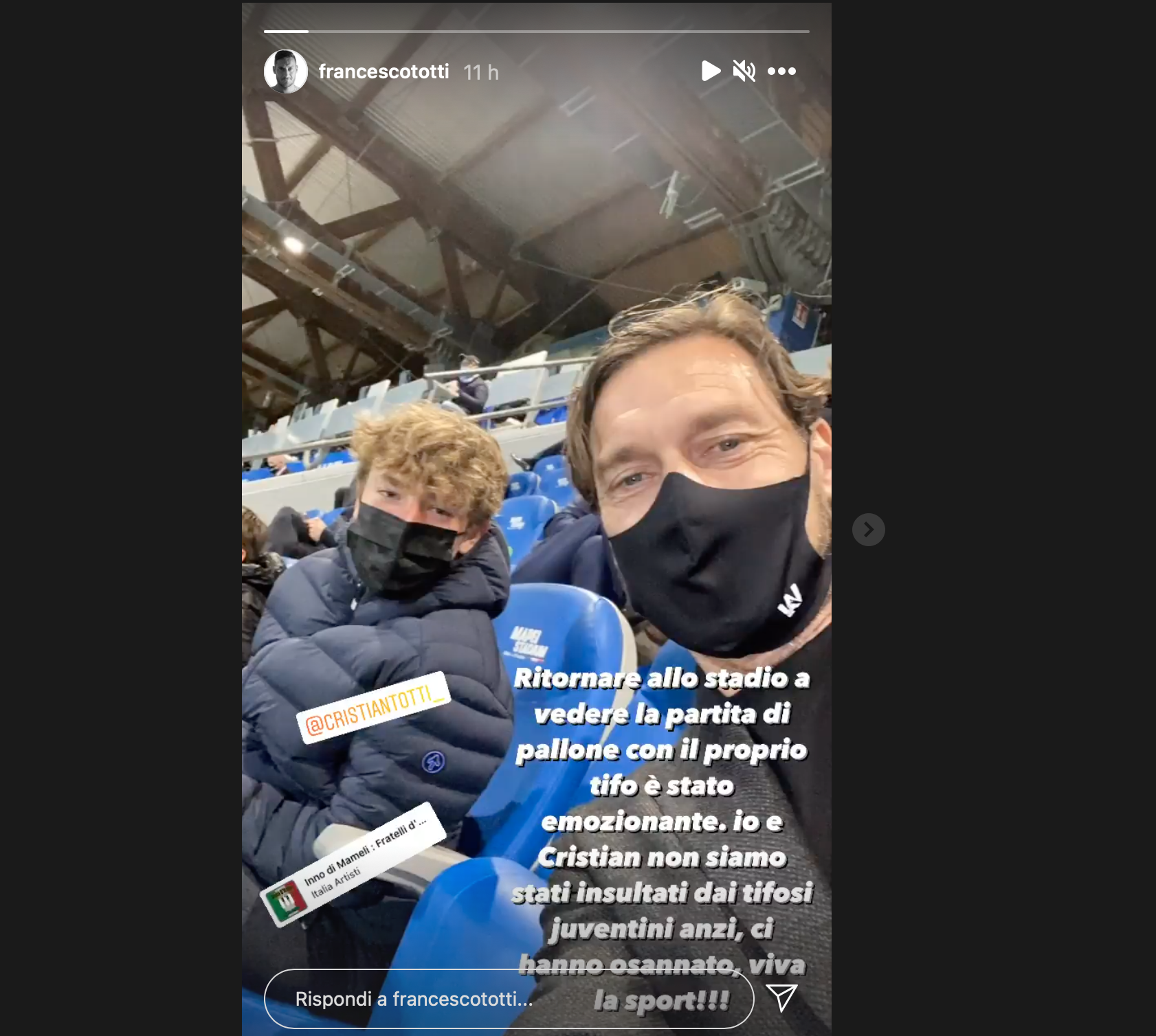 La partita di ieri ha segnato anche il ritorno degli spettatori sugli spalti, che hanno fatto da cornice alla partita incitando e cantando tutto il tempo nei confronti dei loro beniamini. In tribuna autorità poi, presenti molti ex giocatori, tra i quali spiccavano Alessandro Del Piero e Francesco Totti. Proprio l’ex capitano della Roma, allo stadio con il figlio, è stato protagonista di un siparietto con i tifosi della Juventus, riportato poi sulle sue Instagram Stories: “Ritornare allo stadio a vedere la partita di pallone con il proprio figlio è stato emozionante. Io e Cristian non siamo stati insultati dai tifosi juventini anzi, ci hanno osannato, viva lo sport!”.