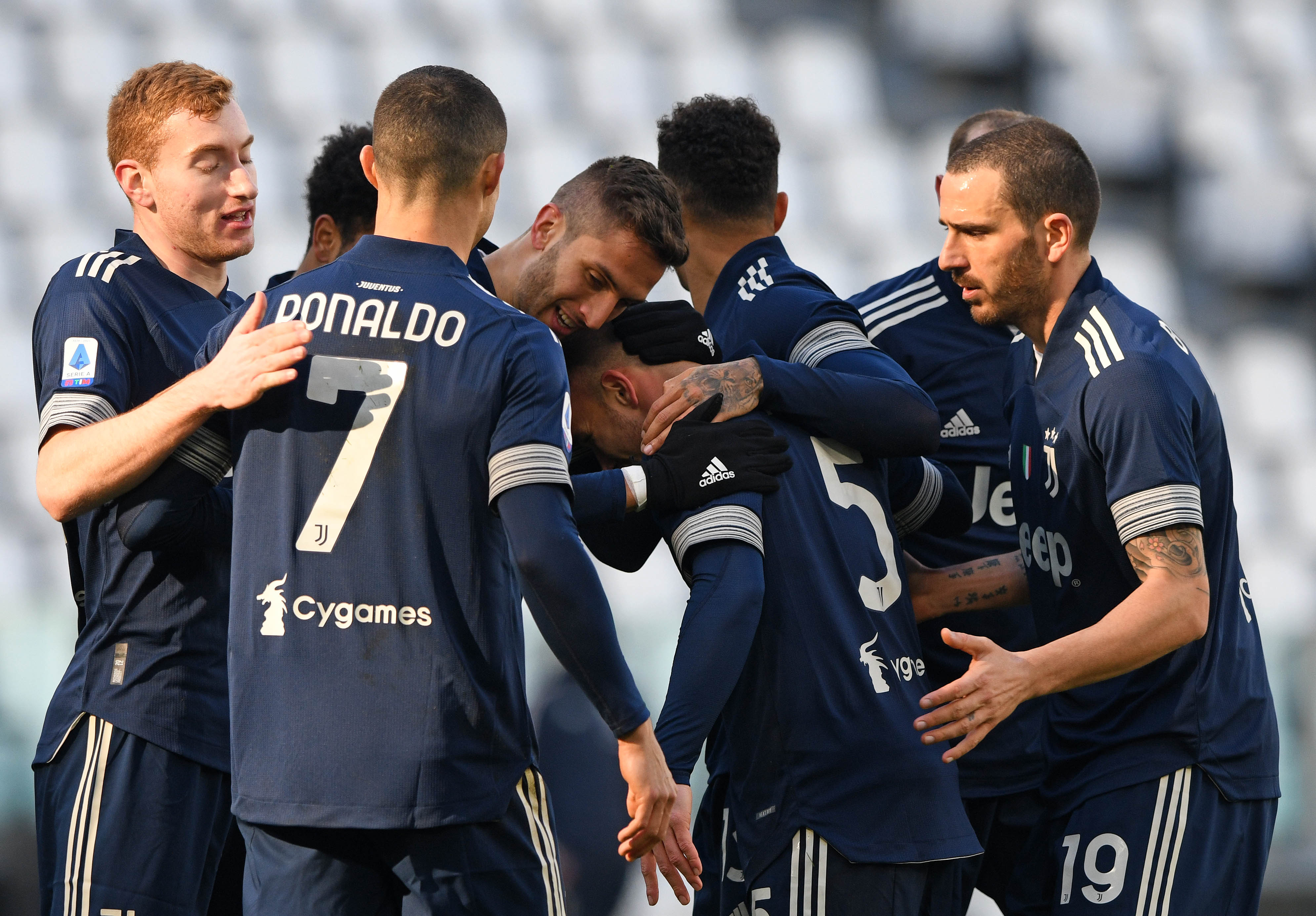 I giocatori della Juventus festeggiano dopo il gol di Arthur contro il Bologna
