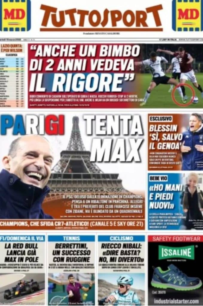 TuttoSport in prima pagina invece apre con una indiscrezione clamorosa di mercato: “Parigi tenta Max”. Il Paris Saint-Germain su Massimiliano Allegri.