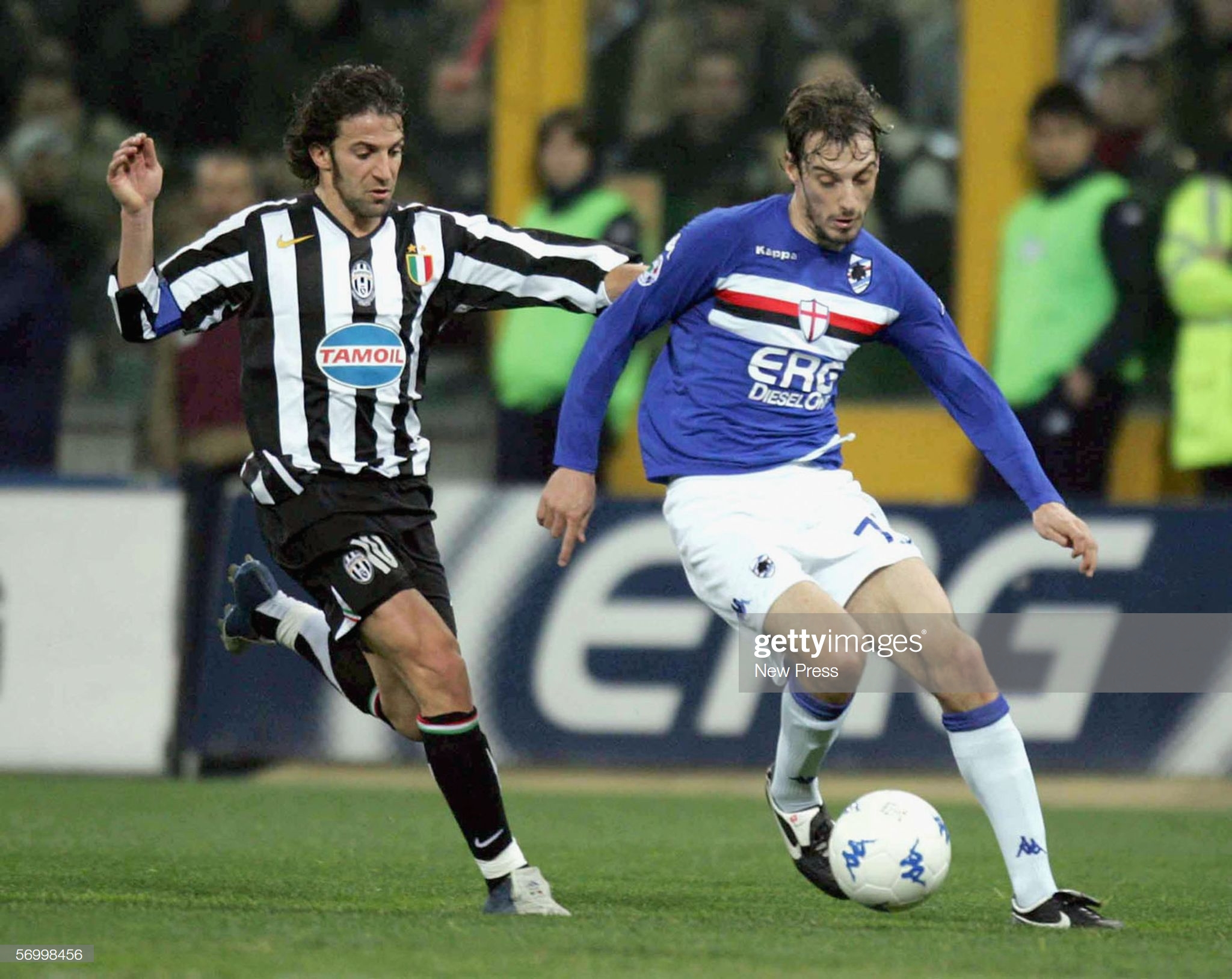 GENOA, ITALY - MARCH 04: Alessandro Del Piero of Juve (L) chases Cristian Zenoni during the Serie A game between Sampdoria and Juventus at the Luigi Ferraris stadium on March 4, 2006 in Genoa, Italy. (Photo by New Press/Getty Images)