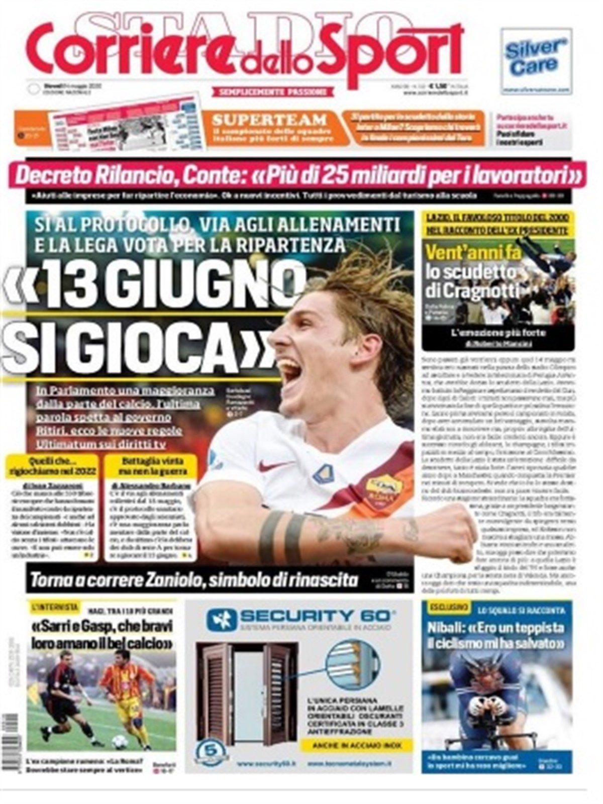 TORINO- L’argomento principale sulla prima pagina del Corriere dello Sport in edicola oggi è la ripresa della Serie A. Riunione di Lega ieri, dalla quale è emerso il 13 giugno come prima data disponibile alla ripartenza del campionato. L’ultima parola, però, anche in questo caso spetta al Governo. In casa Roma, intanto, Nicolò Zaniol9o ha ricominciato a correre dopo la rottura del crociato riportata quattro mesi fa. Spazio anche per un’intervista esclusiva ad Hagi, ex fuoriclasse rumeno del Real Madrid:
