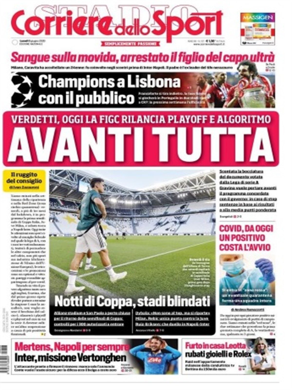 TORINO- La stagione è ormai pronta a ripartire e, sul Corriere dello Sport, è l’argomento principale della prima pagina di oggi. La FIGC è pronta a decidere sui playoff e l’algoritmo, mentre l’Allianz Stadium e il San Paolo si preparano ad accogliere le due semifinali di ritorno di Coppa Italia. C’è spazio poi per l’intervista di Paulo Dybala, che ha affermato di non essere ancora al meglio della condizione, ma di essere pronto a ripartire. Champions League: dai quarti in poi le gare si potrebbero giocare a Lisbona: