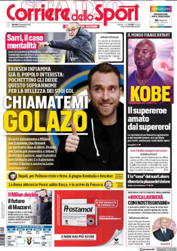 TORINO- L’apertura del Corriere dello Sport di oggi è tutta dedicata allo sbarco in Italia di Christian Eriksen, che da ieri è un nuovo giocatore dell’Inter. Il danese lancia un messaggio al calcio italiano “Chiamatemi golazo”, un soprannome datogli da Pochettino per la bellezza dei suoi gol e capace di infiammare il pubblico. C’è spazio anche per la Juventus, con “Sarri, il caso mentalità”con la frase del tecnico toscano “preferisco perdere al San Paolo che altrove” che ha lasciato perplessi i tifosi bianconeri. Infine, dedica anche a Kobe Bryant, leggenda del basket scomparsa tragicamente domenica sera: