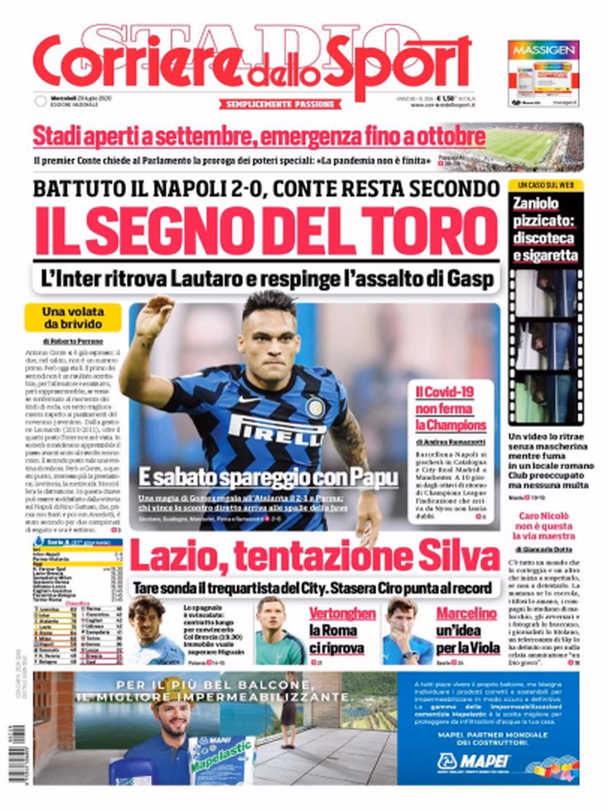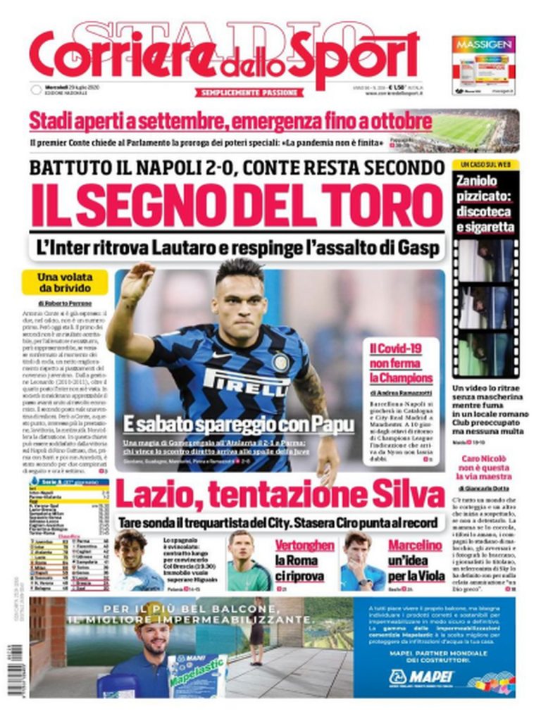 TORINO- Il Corriere dello Sport in edicola oggi si concentra sul successo dell’Inter in casa con il Napoli. Lukaku e compagni restano ora al secondo posto, in attesa dello scontro diretto con l’Atalanta di sabato. Capitolo mercato: per la Lazio spunta l’idea di David Silva, in uscita dal Manchester City. La Roma, intanto, valuta l’arrivo di Vertonghen in caso di addio di Smalling, mentre la Fiorentina potrebbe puntare su Marcelino per la panchina: